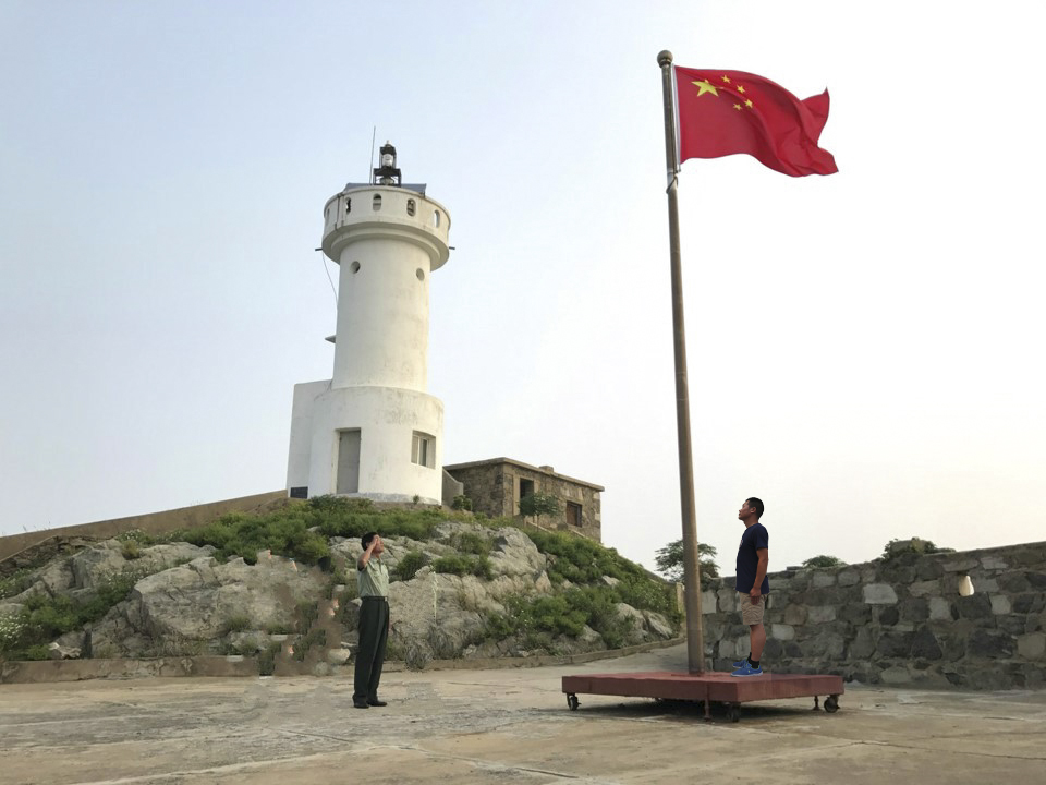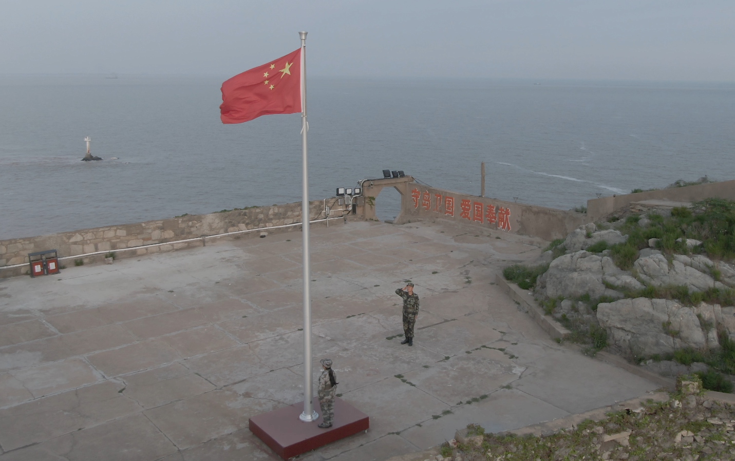 今年8月,王志国回到开山岛探望母亲,母亲带着他在升旗广场举行升旗仪式。(人民网杨起帆 摄)