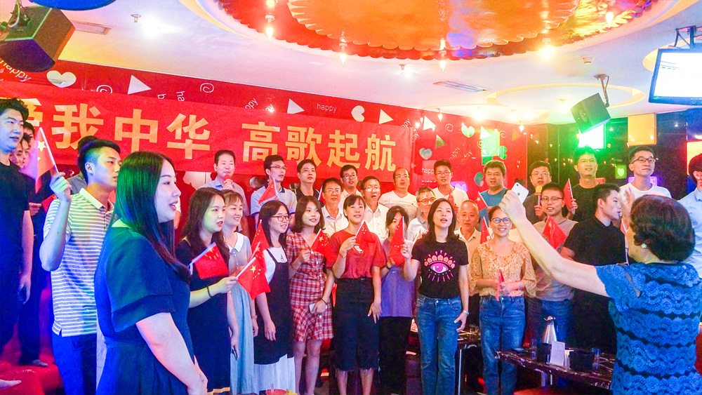 全体员工以饱满的精神状态、洪亮的歌声,手举五星红旗合唱《义勇军进行曲》和《歌唱祖国》。各部门员工代表演唱了《东方之珠》、《我的中国心》、《军港之夜》和《今天是你的生日,中国》等红色经典歌曲,尽情抒发了员工对祖国的热爱,表达了紧密团结在习近平为核心的党中央周围,奋进新时代、共圆中国梦的雄心壮志。