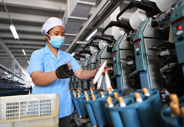 2月18日,已返岗的工人戴着口罩在福建省福州市长乐区正隆纺织有限公司纺织车间里工作。新华社记者 魏培全 摄