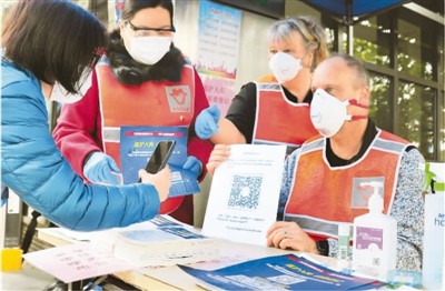 二月二十五日,来自瑞典的一对夫妇在上海陆家嘴滨水小区门口值守,参与社区疫情防控志愿工作。