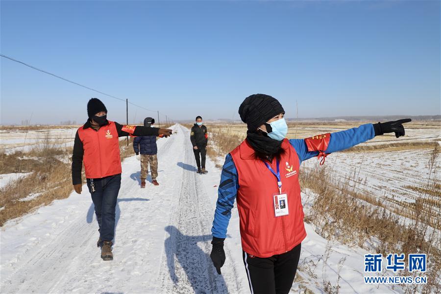 在黑龙江省哈尔滨市延寿县加信镇,42岁的村民蒋艳霞(右一)成为驻守河堤志愿者,在冰雪地里巡逻严守关卡(2月15日摄)。 新华社发