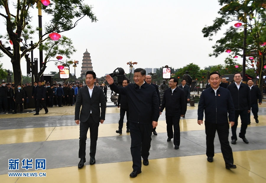 4月20日至23日,中共中央总书记、国家主席、中央军委主席习近平在陕西考察。这是4月22日,习近平在西安大唐不夜城步行街考察时,向游客挥手致意。 新华社记者 谢环驰 摄