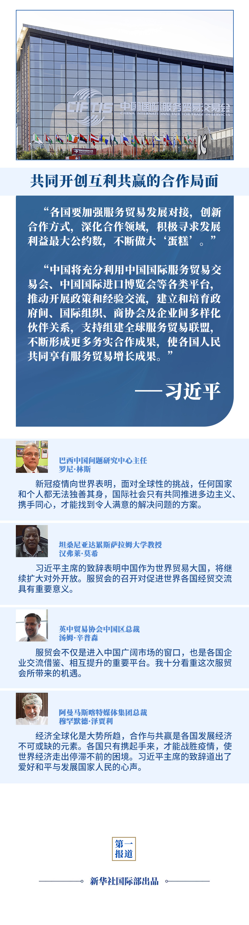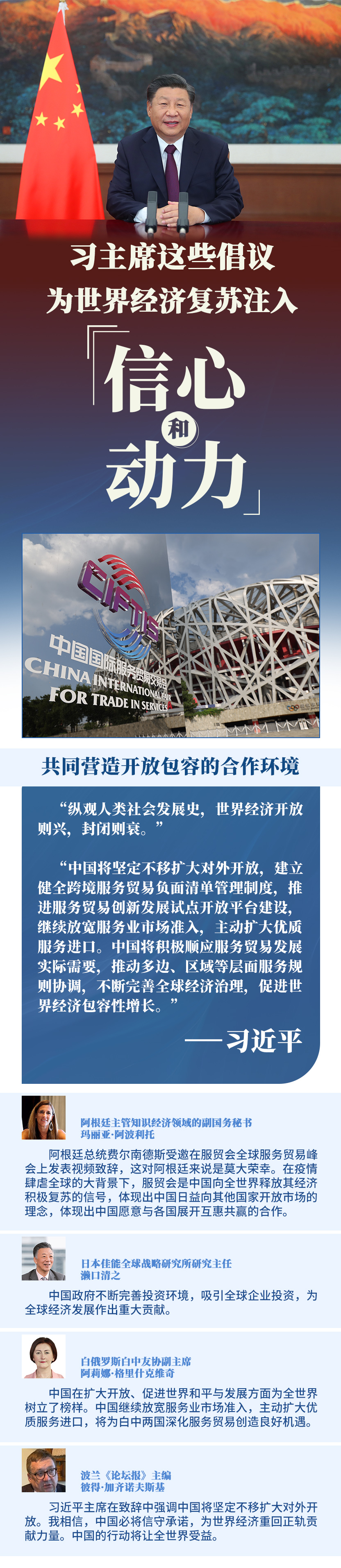 在全球范围新冠疫情尚未得到全面控制、经济全球化遭遇逆流的背景下,习主席就促进全球服务业开放合作提出3点倡议,为推动世界经济尽快复苏注入信心和动力,向国际社会展现中国负责任大国的作为和担当。