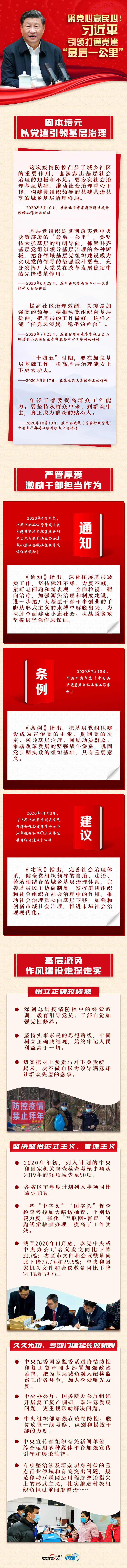 2020年,习近平总书记在多个重要会议和考察活动中强调要坚持大抓基层的鲜明导向,把各领域基层党组织建设成为实现党的领导的坚强战斗堡垒。围绕一线“筑垒工程”,党中央出台哪些措施不断增强基层凝聚力?基层减负效果如何?央视网《联播+》栏目特推出长图,与您一起来学习。