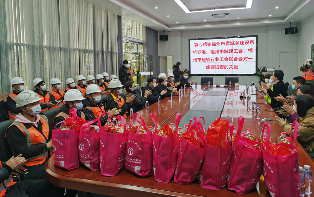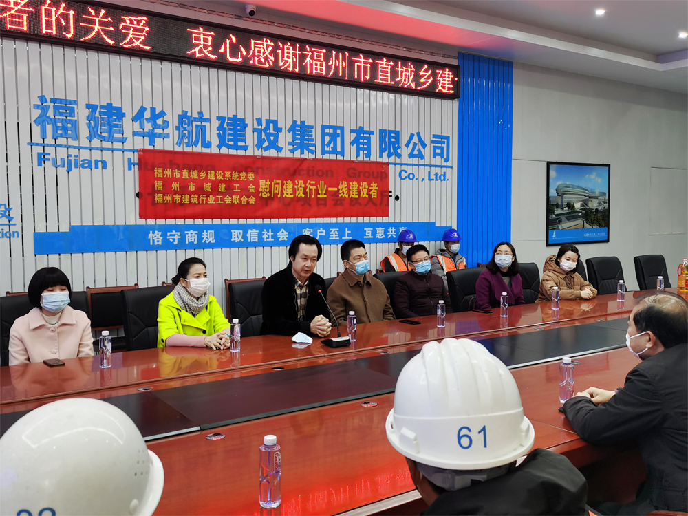 1月20日上午,福州市直城乡建设系统党委林典国书记、福州市城建工会吴流河主席、福州市建筑业协会会长施忠旗、王斌秘书长一行,莅临我司长乐三馆三中心项目部,给华航集团一线建设者们带来春节前的慰问。华航集团陈益魁总经理、瞿生亮副总经理、刘越生副总经理等公司领导陪同,集团党支部、工会、总经办、项目管理中心和项目部的一线职工参加活动。