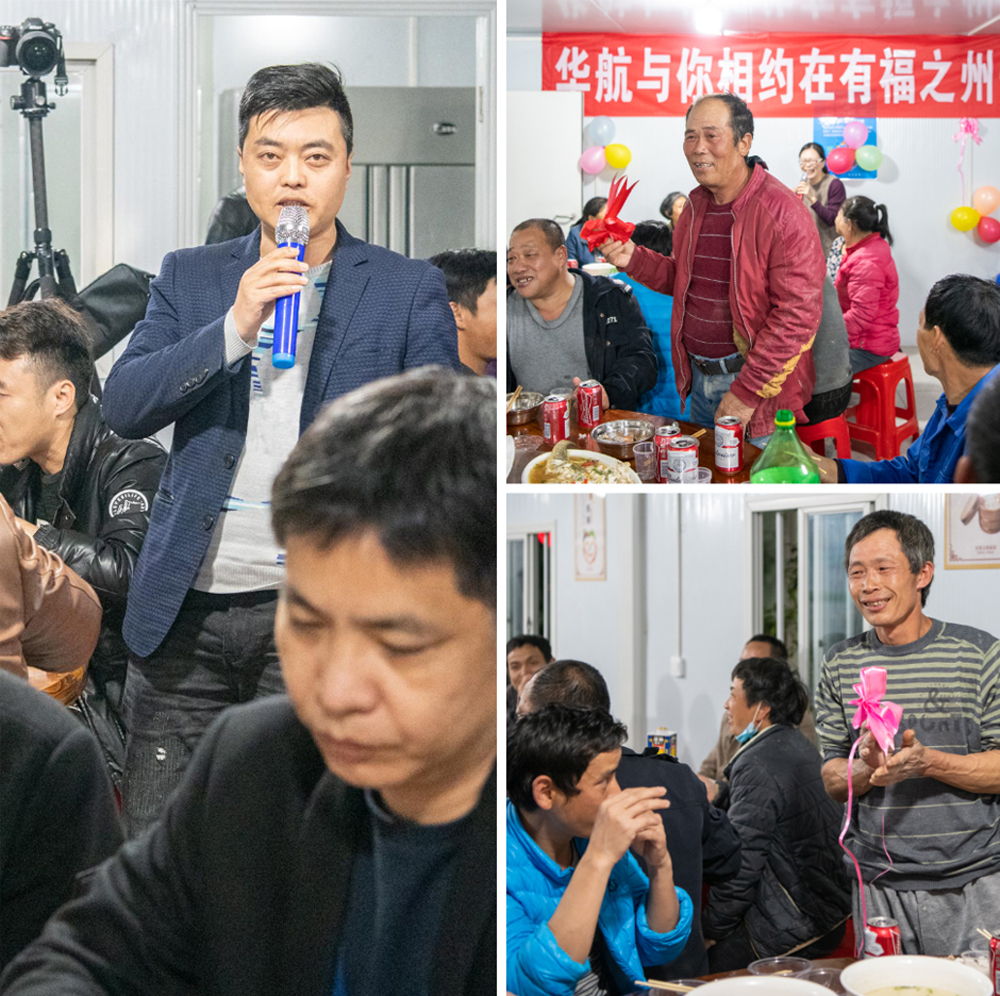 华灯初上,夜幕降临,华航集团董事长、党支部书记张华官,陈益魁总经理等领导和党员同志们来到项目部年夜饭现场,与一线建设者们共同欢度节日。在彩花、汽球妆点下的年夜饭现场,不时传出阵阵欢声笑语。张华官书记邀请大家共同举杯,他说,你们积极响应国家号召,主动放弃与家人团聚的机会,为疫情防控和增产增效贡献自己的力量,这样的付出让人感动也值得珍视,企业会扎实做好各方面保障,让你们在福州度过一个美好的春节。