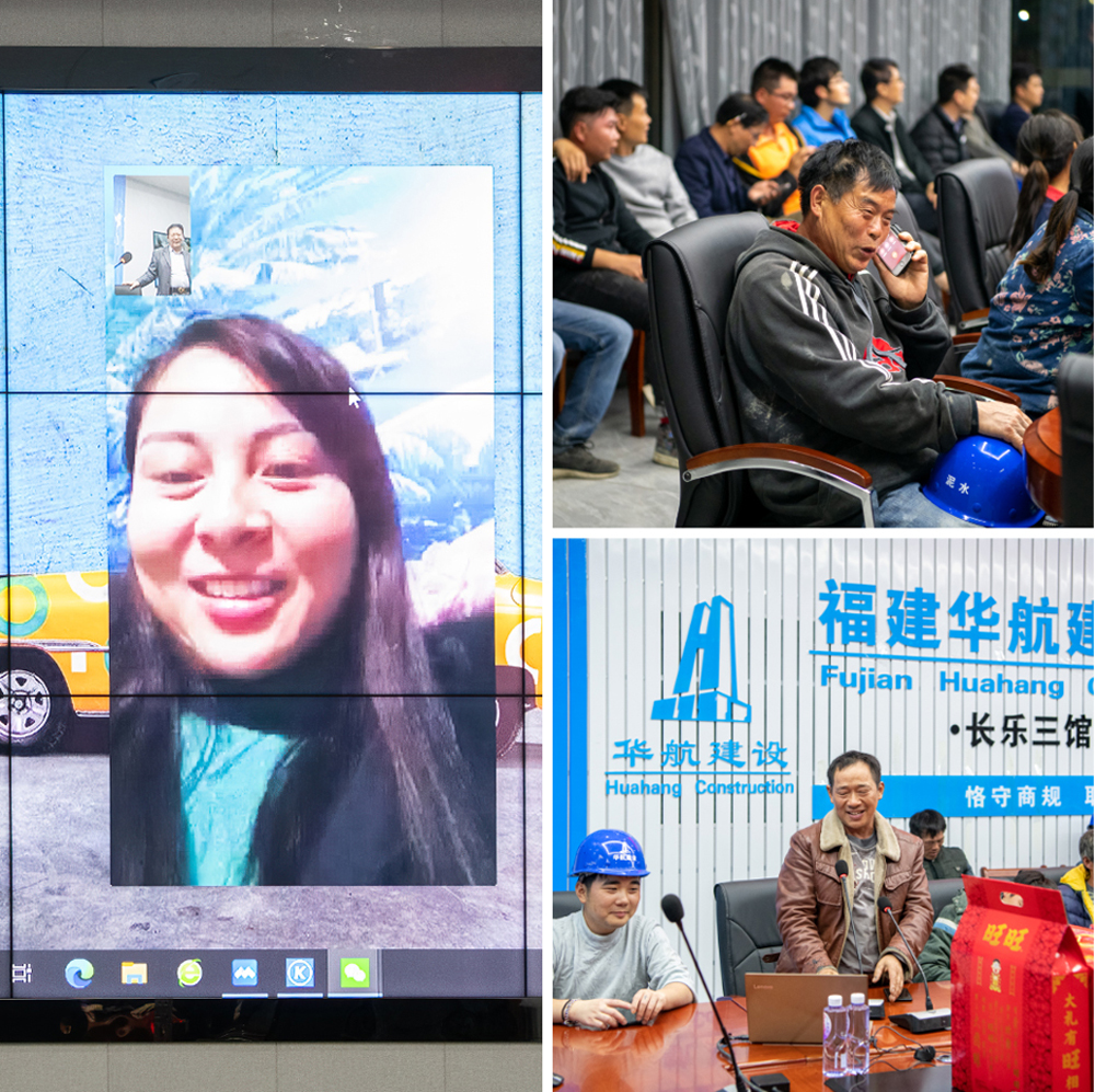 “传递亲情云相聚”现场,工人代表们通过大屏幕与家人连线。他们之中有为了响应政府号召留在当地过年的年轻恋人,本应回家结婚的他们只能推迟婚期;一位外公在外孙女的声声呼唤中,心情激动得都顾不得与女儿说话了;还有儿子正在服役,因为部队纪律不便连线的父亲,听着他思念亲人又顾全大局的话语,大家肃然起敬并报以热烈的掌声。这跨越空间的连接,让许多两地的心连在了一起,也让建设者们把就地过年的温暖和欢乐告诉了家人,让家人们安心又暖心。