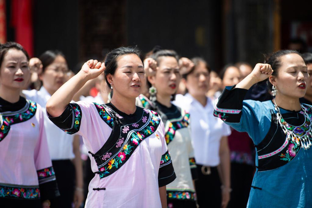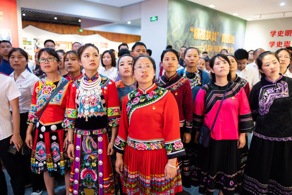 湖南湘西十八洞村开展新党员代表入党宣誓活动并参观精准扶贫展示厅。新华社记者陈思汗摄