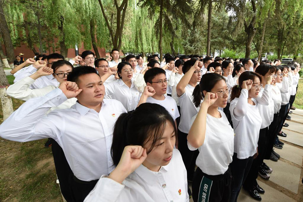 在河北,新党员代表在西柏坡纪念馆广场进行入党宣誓活动。新华社记者王晓摄