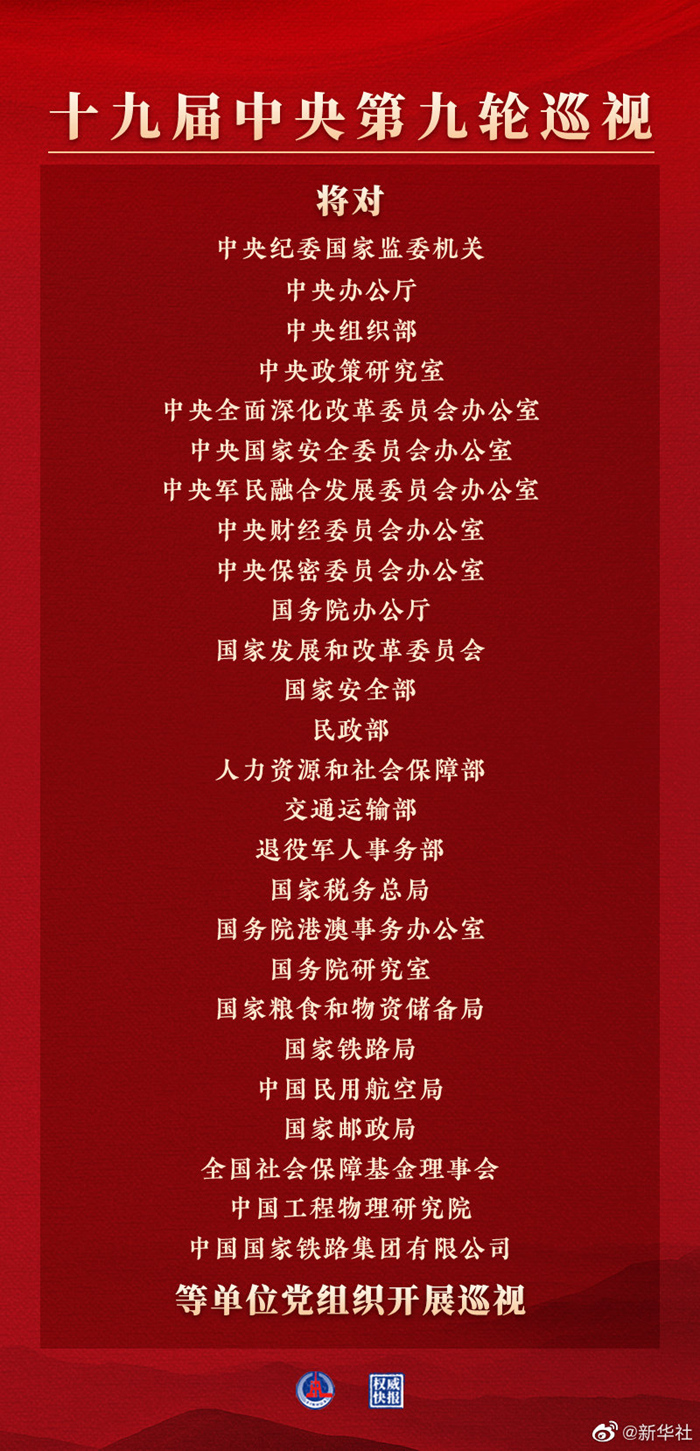 新华社北京3月23日电 经党中央批准,十九届中央第九轮巡视将对中央纪委国家监委机关、中央办公厅、中央组织部、中央政策研究室、中央全面深化改革委员会办公室、中央国家安全委员会办公室、中央军民融合发展委员会办公室、中央财经委员会办公室、中央保密委员会办公室;国务院办公厅、国家发展和改革委员会、国家安全部、民政部、人力资源和社会保障部、交通运输部、退役军人事务部、国家税务总局、国务院港澳事务办公室、国务院研究室、国家粮食和物资储备局、国家铁路局、中国民用航空局、国家邮政局;全国社会保障基金理事会、中国工程物理研究院、中国国家铁路集团有限公司等单位党组织开展巡视。