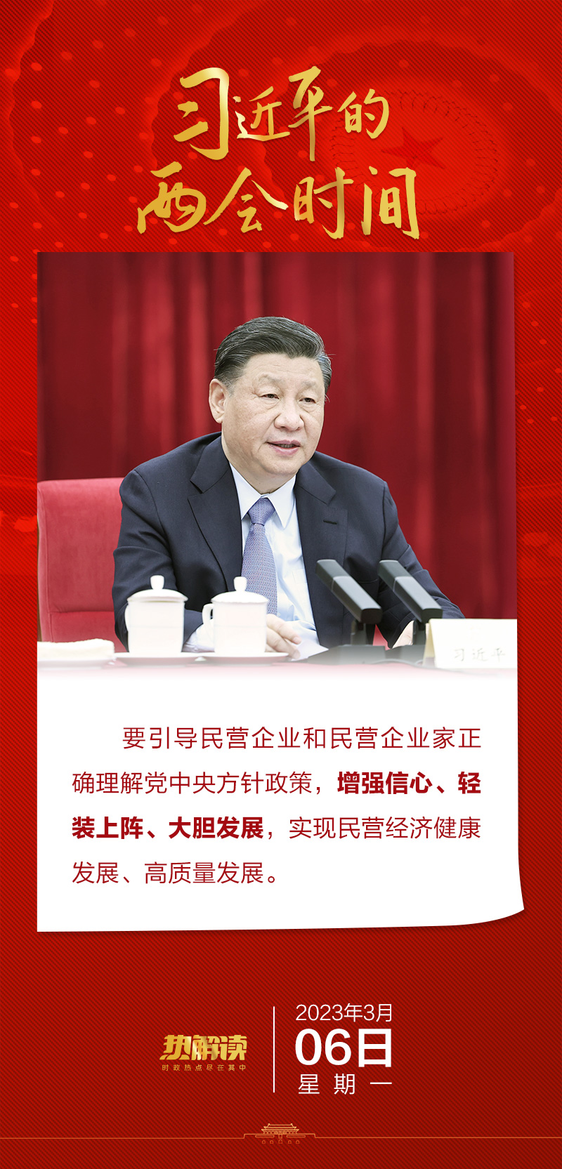 3月6日下午,习近平总书记亲切看望了参加全国政协十四届一次会议的民建、工商联界委员,并参加联组会,听取意见和建议。联组会上,总书记鼓励广大民营企业家“增强信心、轻装上阵、大胆发展,实现民营经济健康发展、高质量发展”。