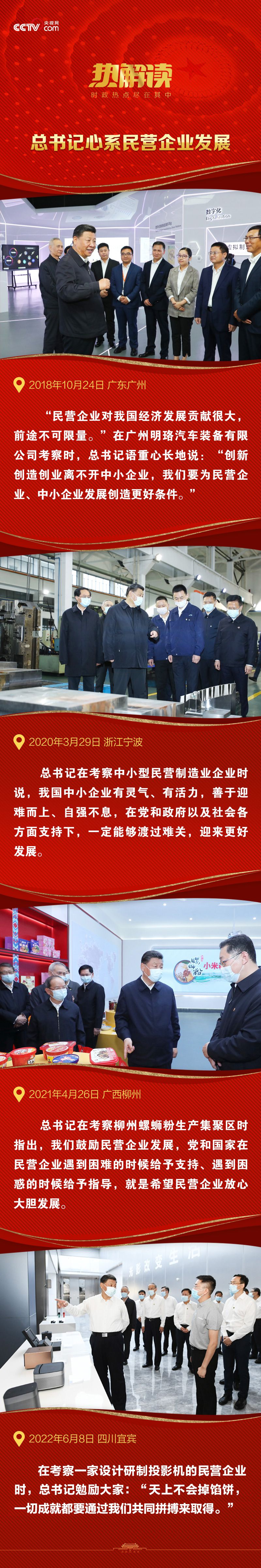 从在地方工作期间大力支持民营经济发展、为民营企业排忧解难,到在中央工作后主持召开民营企业座谈会、多次走进民营企业考察调研,习近平总书记对于民营企业的重视、关心、支持始终如一。