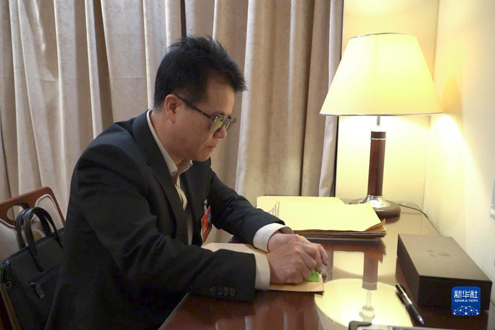 2023年3月7日,王永澄在驻地房间用盲文纸书写建议。新华社记者 张辛欣 摄