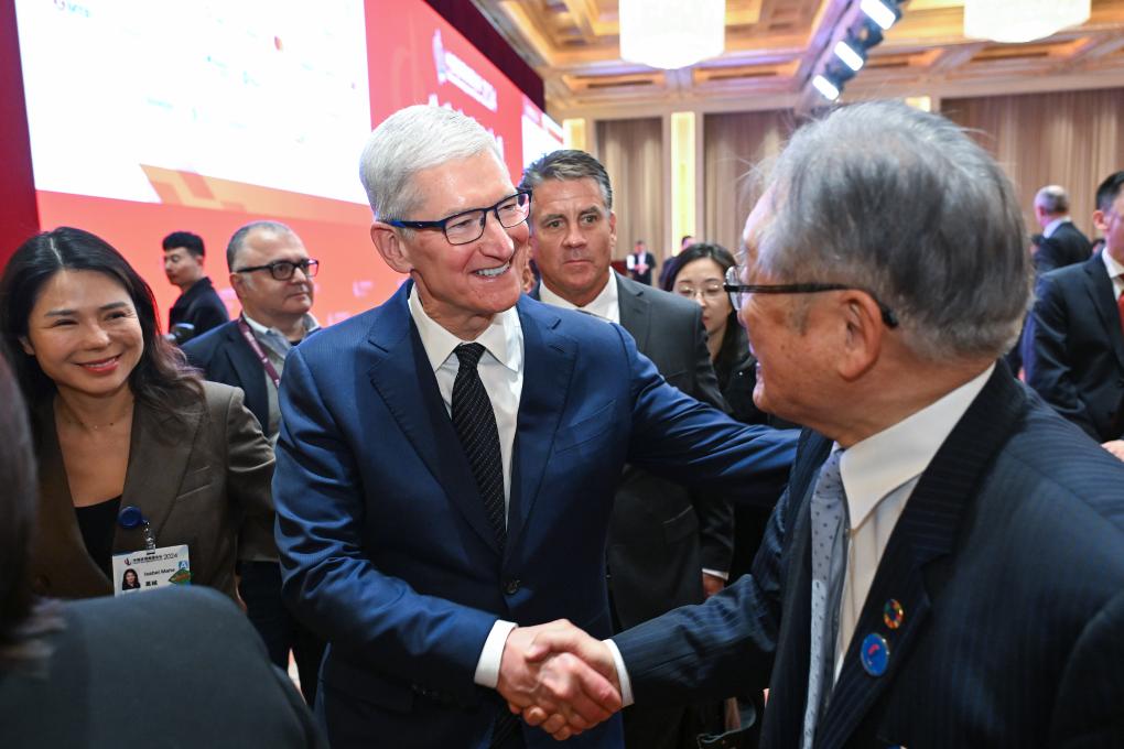 3月24日,苹果公司首席执行官蒂姆·库克(中)在中国发展高层论坛2024年年会会场与嘉宾交流。新华社记者 李鑫 摄